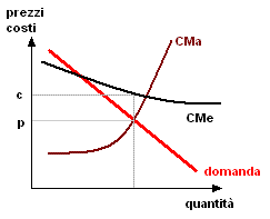 Come si evince dal grafico la produzione del bene in questione è in perdita. Il prezzo P è determinato nel breve periodo dall'uguaglianza tra Ricavi Marginali (curva domanda) e Costi Marginali (curva CMa) ed è inferiore ai costi c. I costi fissi sono molto alti e la curva dei costi medi è superiore all'equilibrio causando una perdita economica per l'impresa concorrente ( C > P ). In questa situazione una nuova impresa non avrebbe alcun motivo per restare nel mercato o per entrarvi. Solo le imprese con costi medi inferiori, ad esempio dovuti alle economie di produzione congiunta, potranno presenziare il mercato fino al punto da controllarlo interamente in regime di "monopolio naturale".
